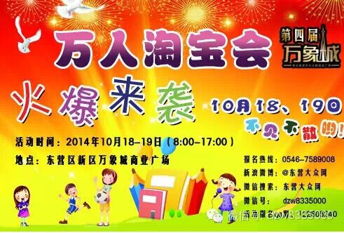 东营大众网第四届万象城万人淘宝进入倒计时第6天,今天,东营各大商场x展架已经布置到位,50000张宣传单页也在陆续的发放,有着各种附加值的门票也正在印刷中。感谢各位土豪赞助商的鼎力支持,首先感谢东营万象游乐城、恒大黄河生态城、恒大影城、MINI未来城的大力支持,凡转发此微信到朋友圈并关注东营大众网即可于10月18、19日到新区万象城淘宝会现场领取万象游乐城游玩劵、恒大免费观影劵、东营咖啡之翼免费披萨劵一份,参与现场活动还有机会获得土豪东营活动网提供的价值80元3D魔幻展门票1000张,当然还有土豪广饶孙子文化园提供的价值60元的游玩劵500张.现场还将抽出平板电脑一台,这么多豪礼还等什么,快转发报名吧!