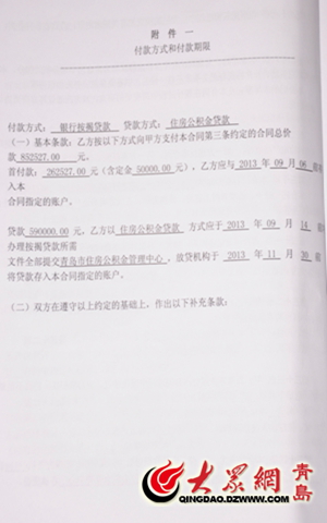 张华告诉记者, 2013年他与妻子选中了绿地?欢乐滨海城项目的一套房屋,并于8月份首付26万元签订了购房协议,根据购房合同附件约定,购房付款方式为公积金贷款的购房者须于2013年9月14日前向青岛市住房公积金管理中心提交所有贷款材料和文件,于2013年11月30日前将贷款存入合同指定的账户。