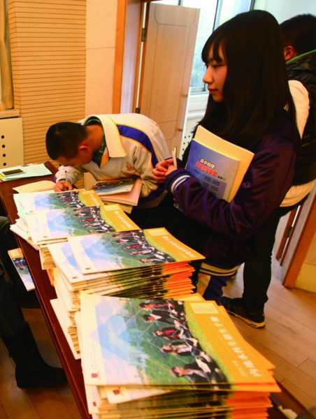 同学们在挑选香港中文大学的宣传材料记者 王晓峰 摄